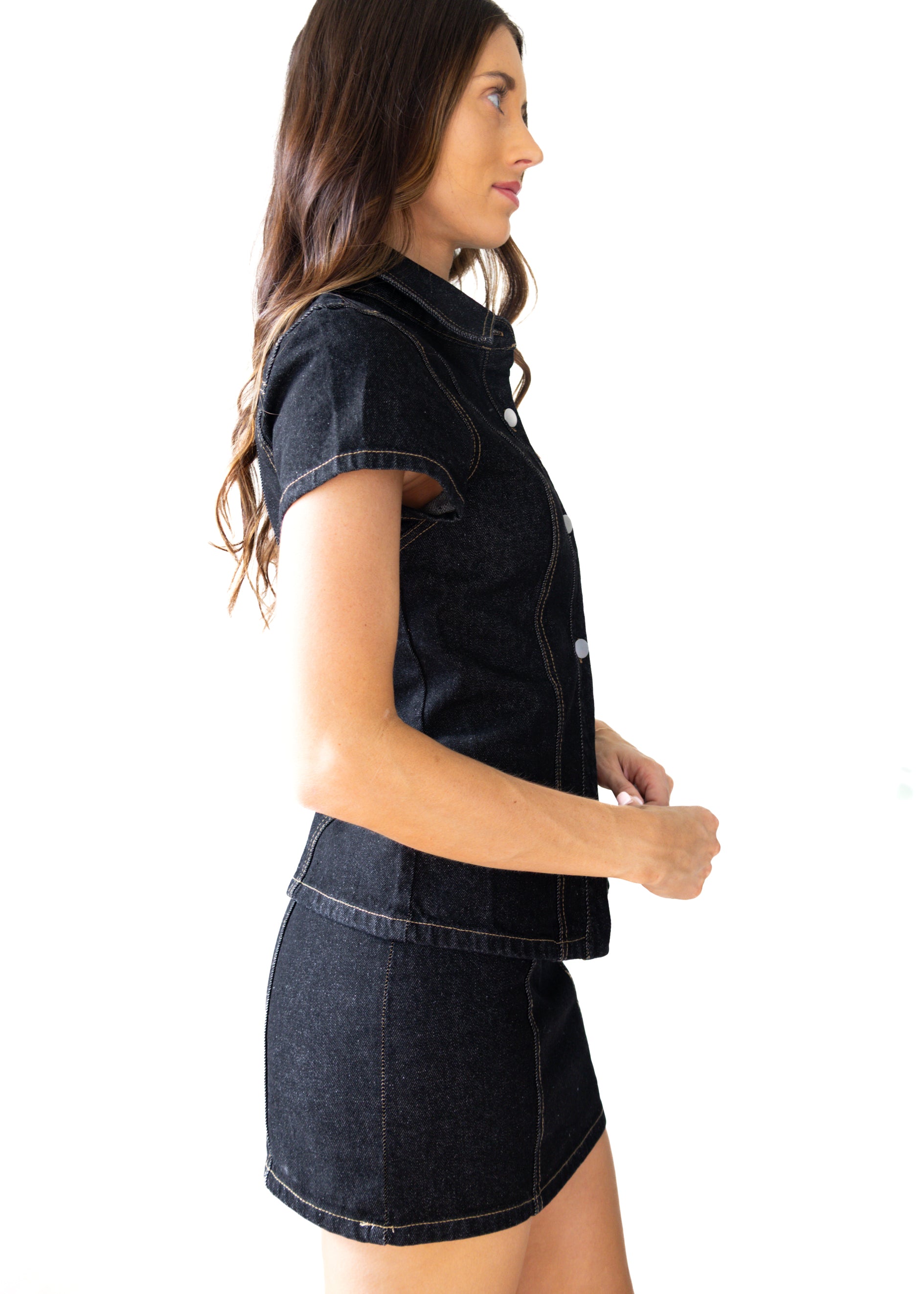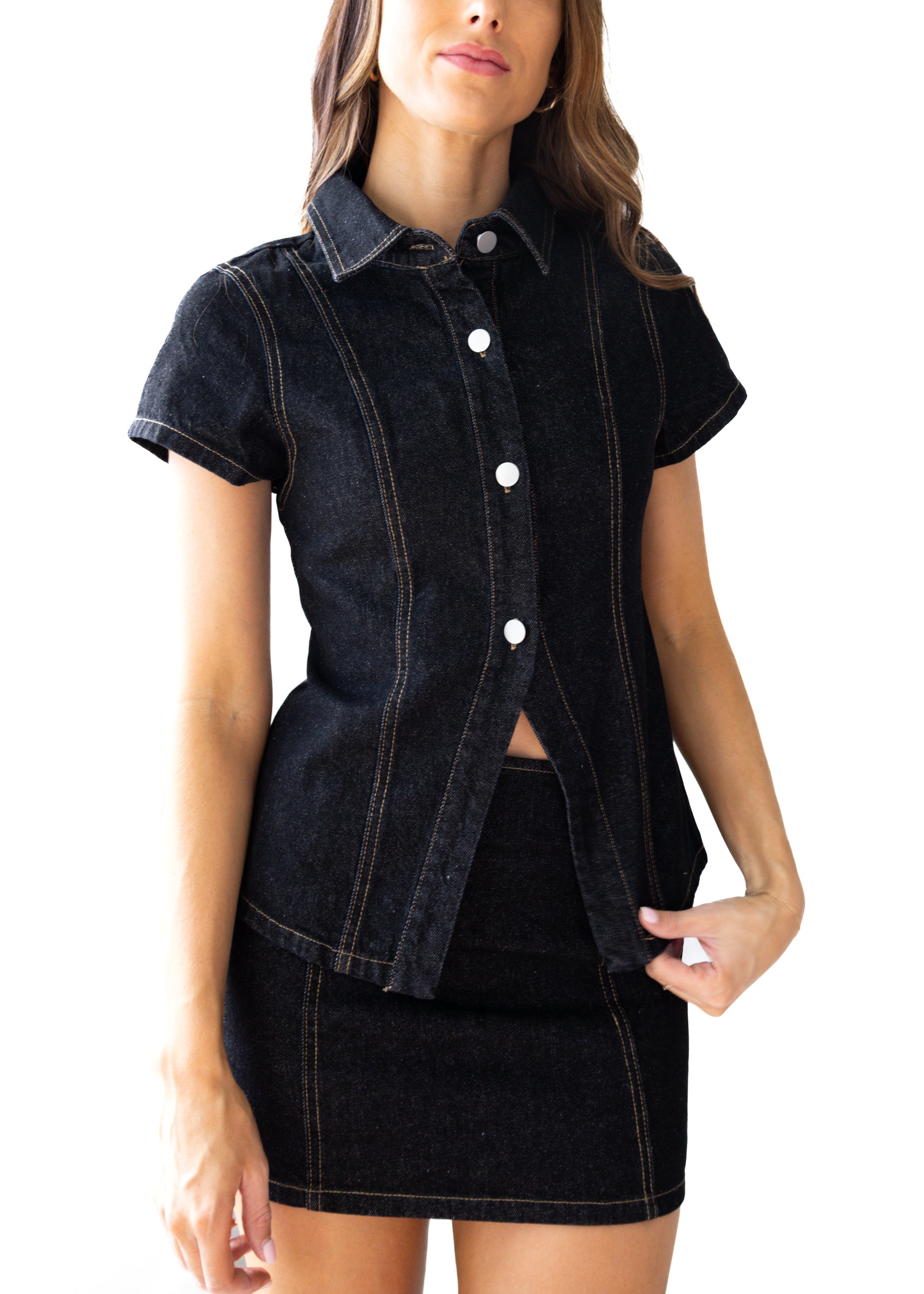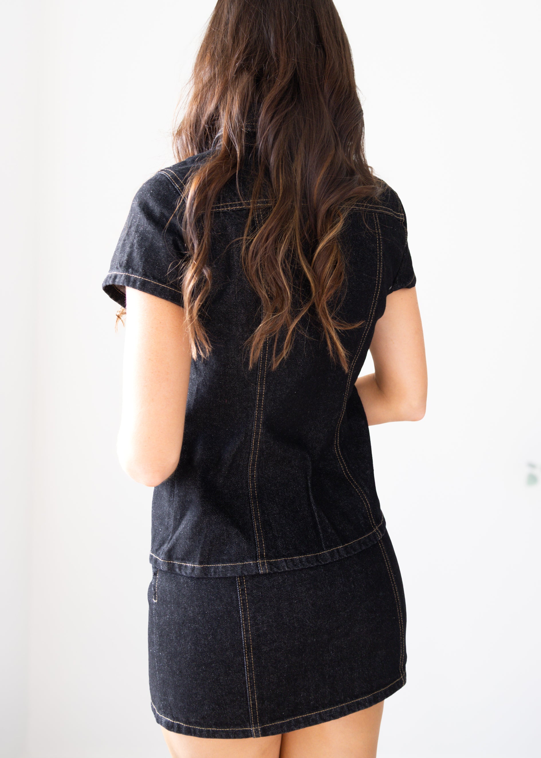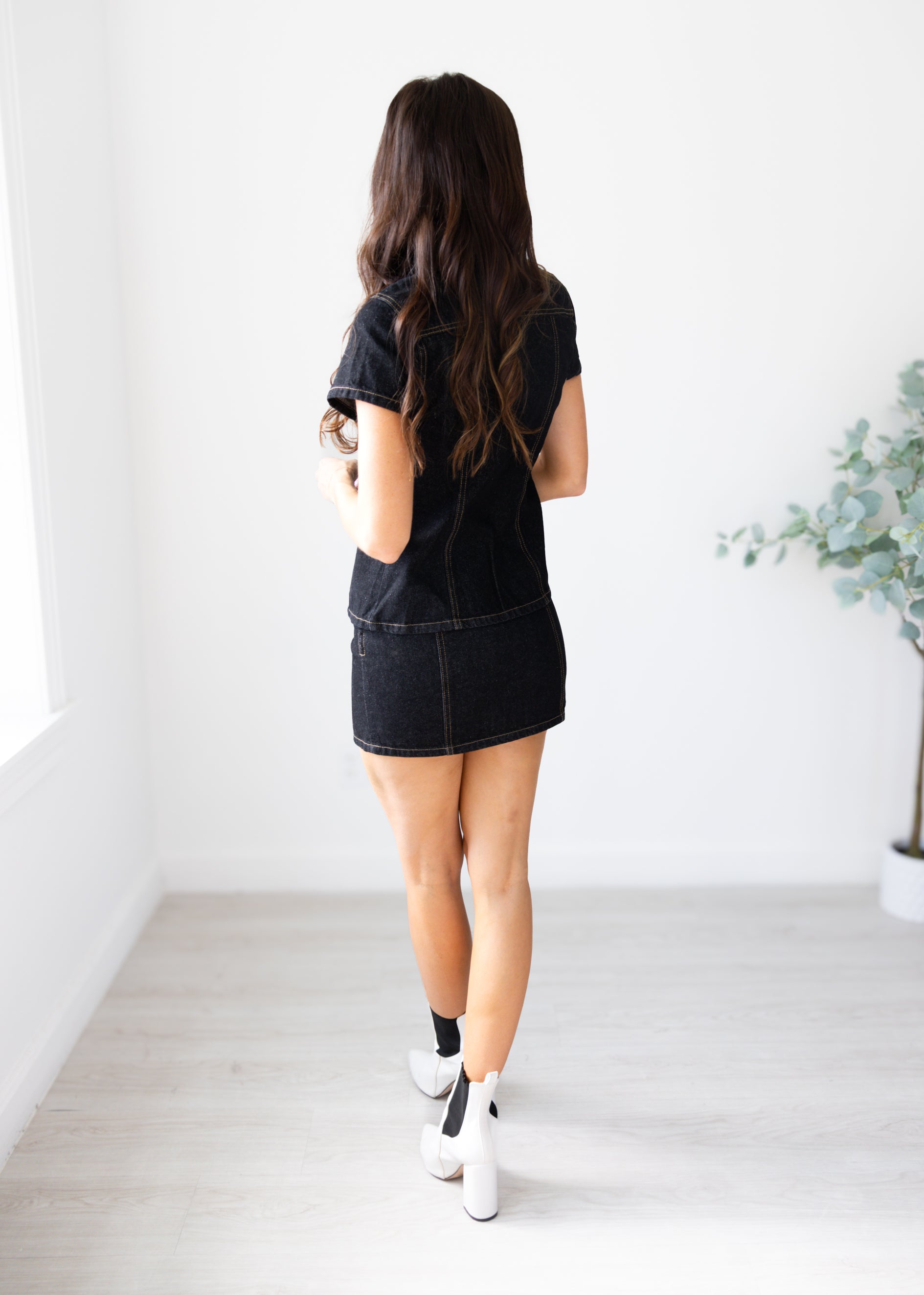 Turn heads in the Brittany Black Denim Set, featuring a chic skirt and matching button-down top that make outfit planning a breeze. This playful duo blends classic denim charm with coordinated style, perfect for adding a fun, polished touch to your wardrobe!