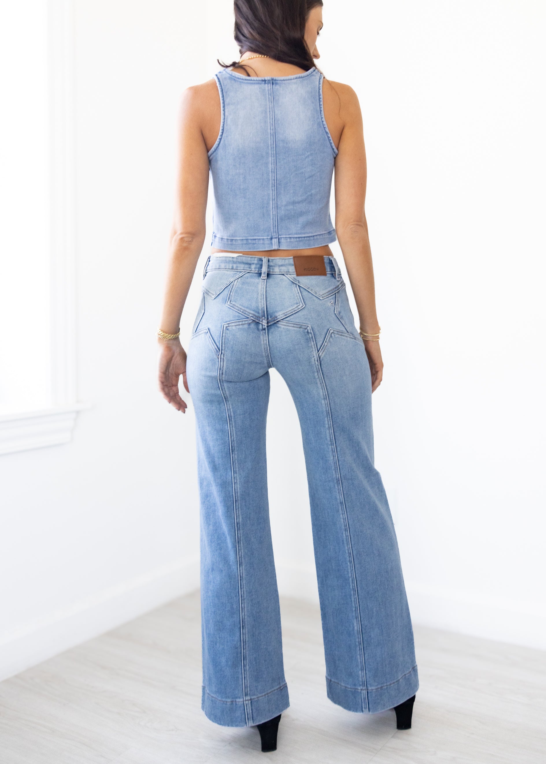 Keep it cool and classic in the Light Wash Denim Tank. This sleeveless top features a soft, faded denim fabric with a flattering cropped fit and subtle seam detailing. Perfect for pairing with high-rise jeans or skirts, it’s your go-to for effortless summer style with a laid-back edge.