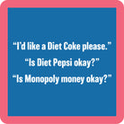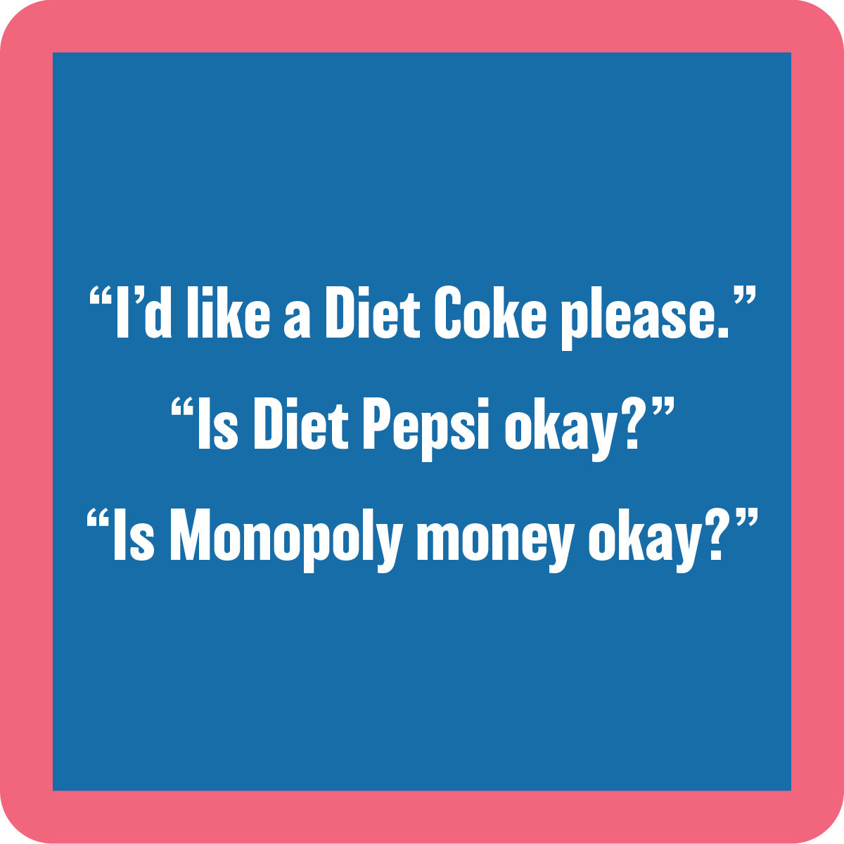 Add a little humor to your coffee table with the Diet Coke Quote Coaster — the perfect accessory for every true Diet Coke lover. Featuring the relatable quote, “I’d like a Diet Coke please.” “Is Diet Pepsi okay?” “Is Monopoly money okay?”, this fun and witty coaster is sure to spark laughs and conversations. Designed to protect your surfaces from condensation while adding personality to your home, bar cart, or office desk, it also makes a great gift for soda enthusiasts, hostesses, or friends who know Diet Coke is non-negotiable. Stylish, playful, and practical, it’s a must-have for anyone loyal to their favorite fizzy drink.