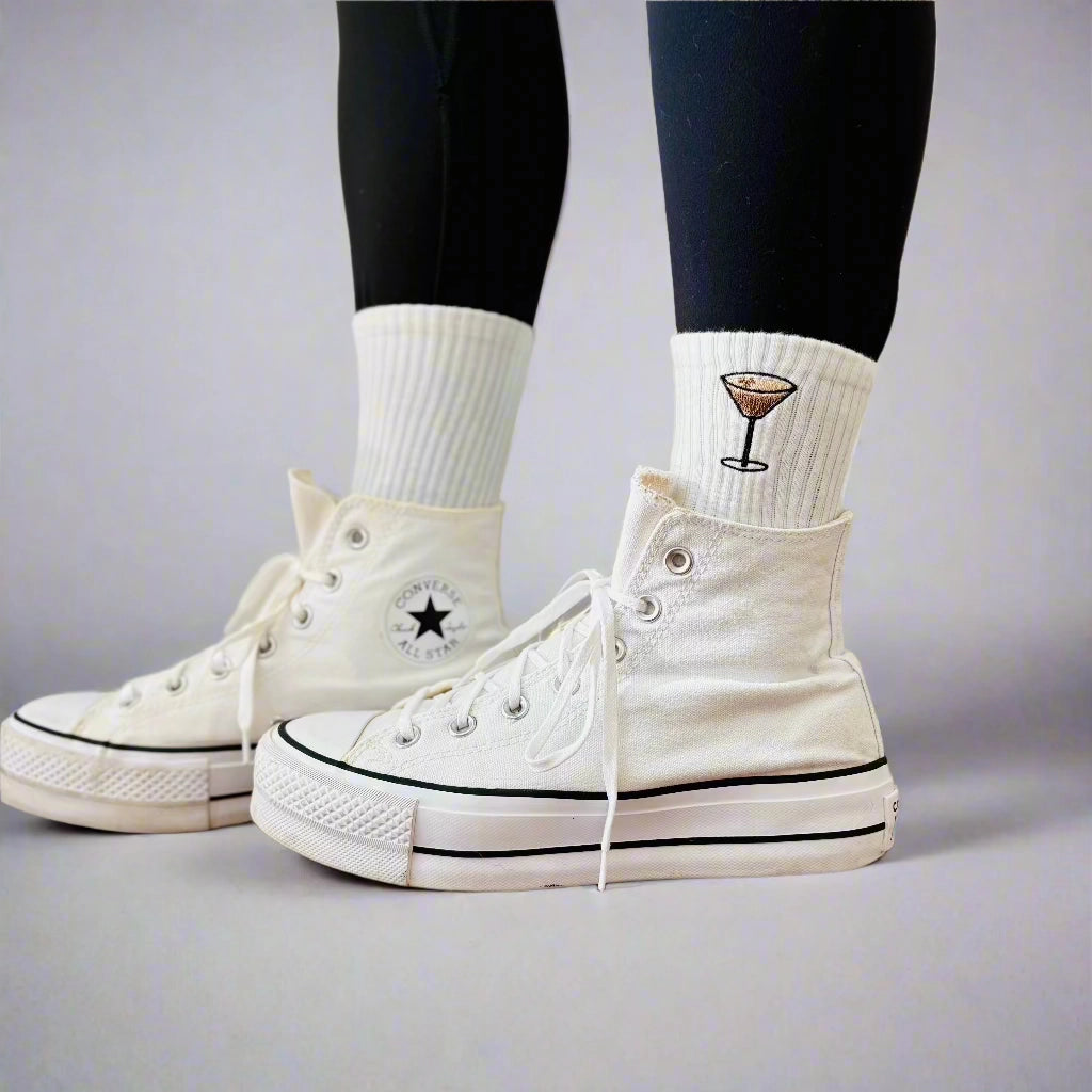 Shake up your everyday style with our Embroidered Espresso Martini Crew Socks. These classic white crew socks feature a chic embroidered espresso martini design, adding the perfect touch of playful sophistication to any outfit. Crafted with a soft, breathable knit and comfortable ribbed cuff, they’re ideal for pairing with sneakers, loafers, or lounging at home. Whether you’re a coffee lover, cocktail enthusiast, or shopping for a fun gift, these espresso martini socks are a must-have accessory for elevating your casual look.