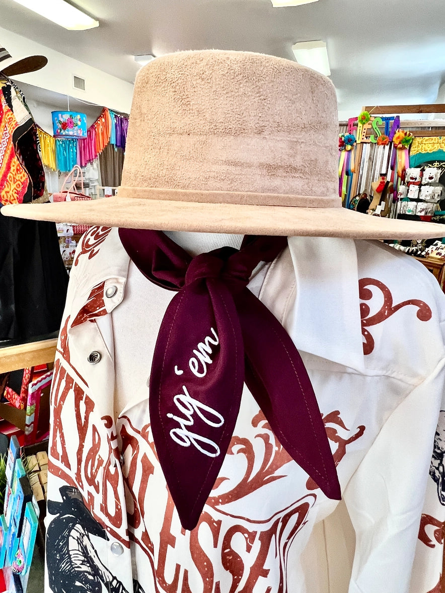 Add a bold pop of color and timeless charm with this maroon ascot scarf, featuring elegant white embroidered text for that extra touch of detail. Measuring approx. 38-42 inches in length, this fabulous scarf is perfect to wear as a classic neck accent, a stylish tote bag accessory, hat band or even tied to your hair for a chic look.