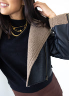 Turn up the edge with the Luxe Rebel Jacket — your new cold-weather essential with major cool-girl energy. Crafted from sleek faux leather and lined with plush sherpa, it blends effortless style with cozy comfort. From coffee runs to nights out, this statement jacket adds the perfect touch of luxe rebellion to any look.