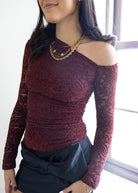 The Cleo Top is designed to stand out with its one-shoulder neckline and allover velvet burnout lace that adds soft texture and depth. Its body-hugging, cropped silhouette stops right at the waistline, creating a sleek base that’s perfect for pairing high or low.