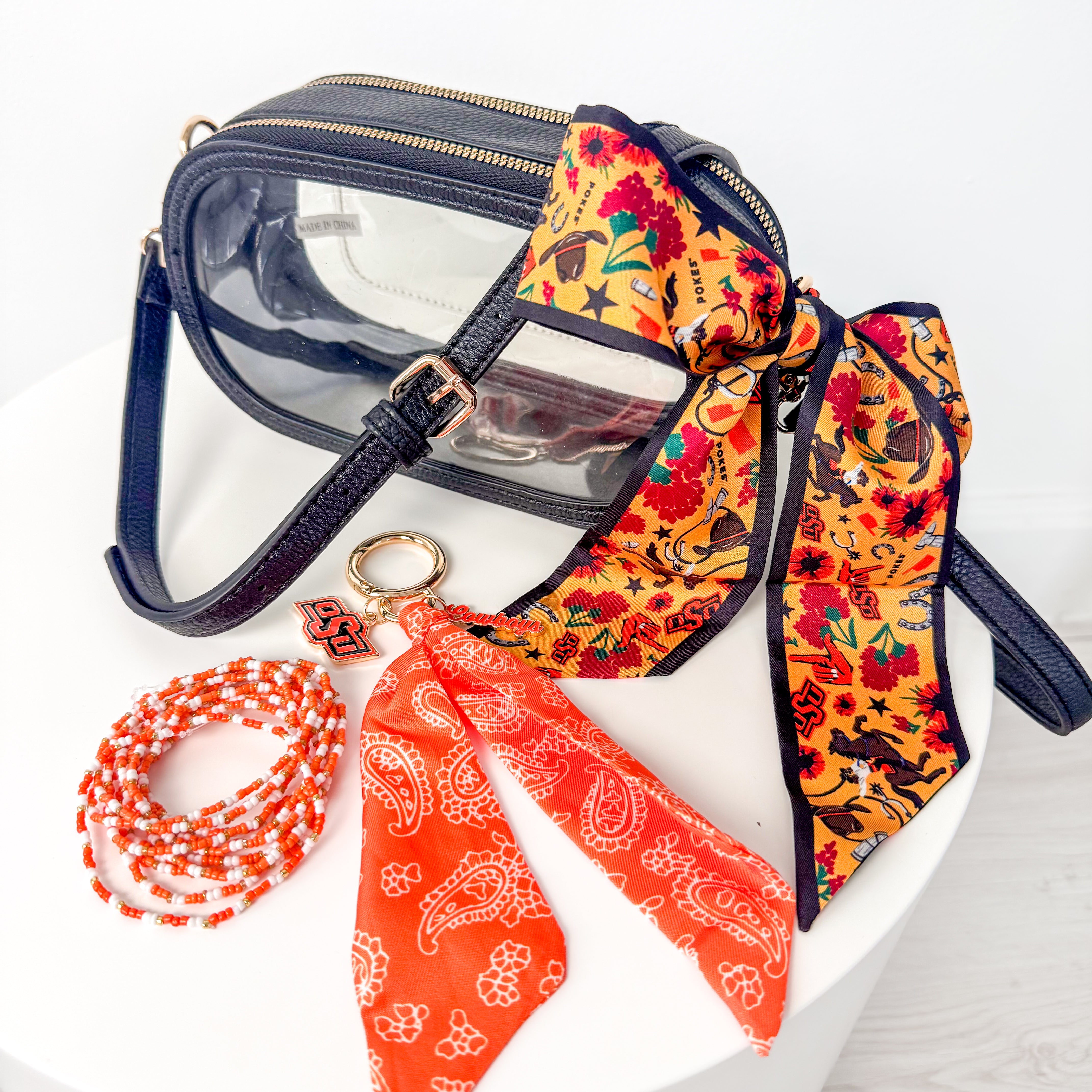 Cheer on the Cowboys in style with this all-in-one gameday set! The silky Oklahoma State Twilly Scarf, stadium-approved black clear purse, cute OSU scarf keychain, and festive orange & white beaded bracelet set make it easy to show your school pride from head to toe. Cute, coordinated, and stadium ready—this bundle has everything you need to look gameday perfect!