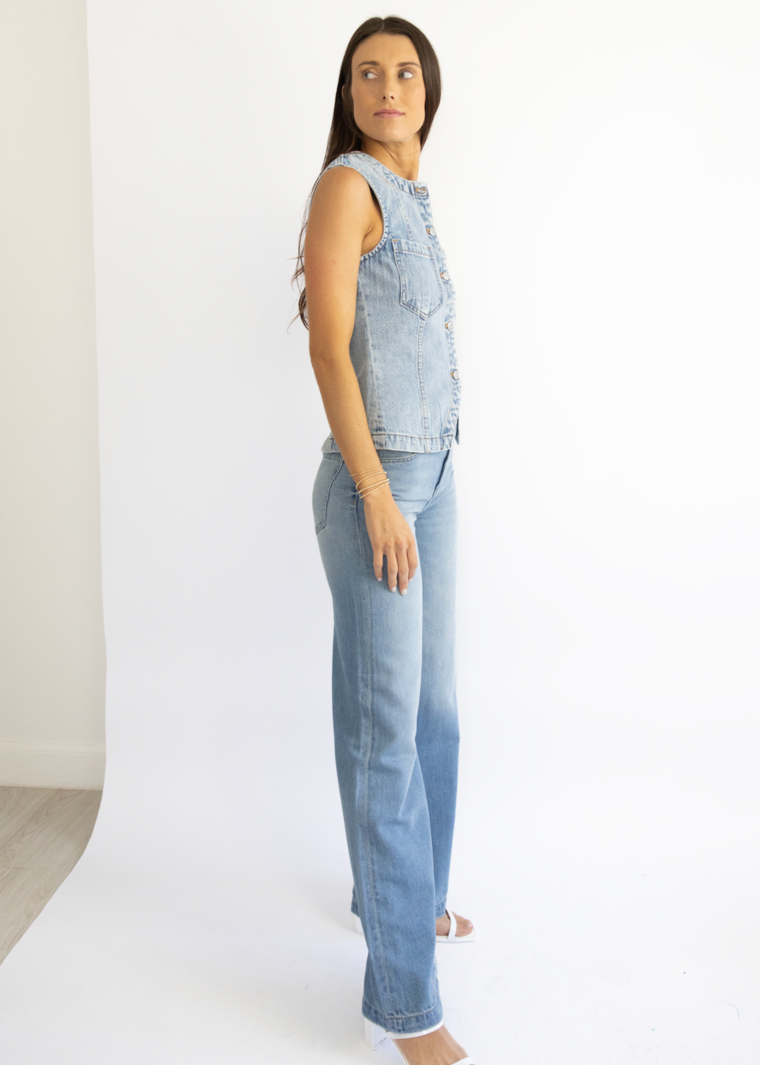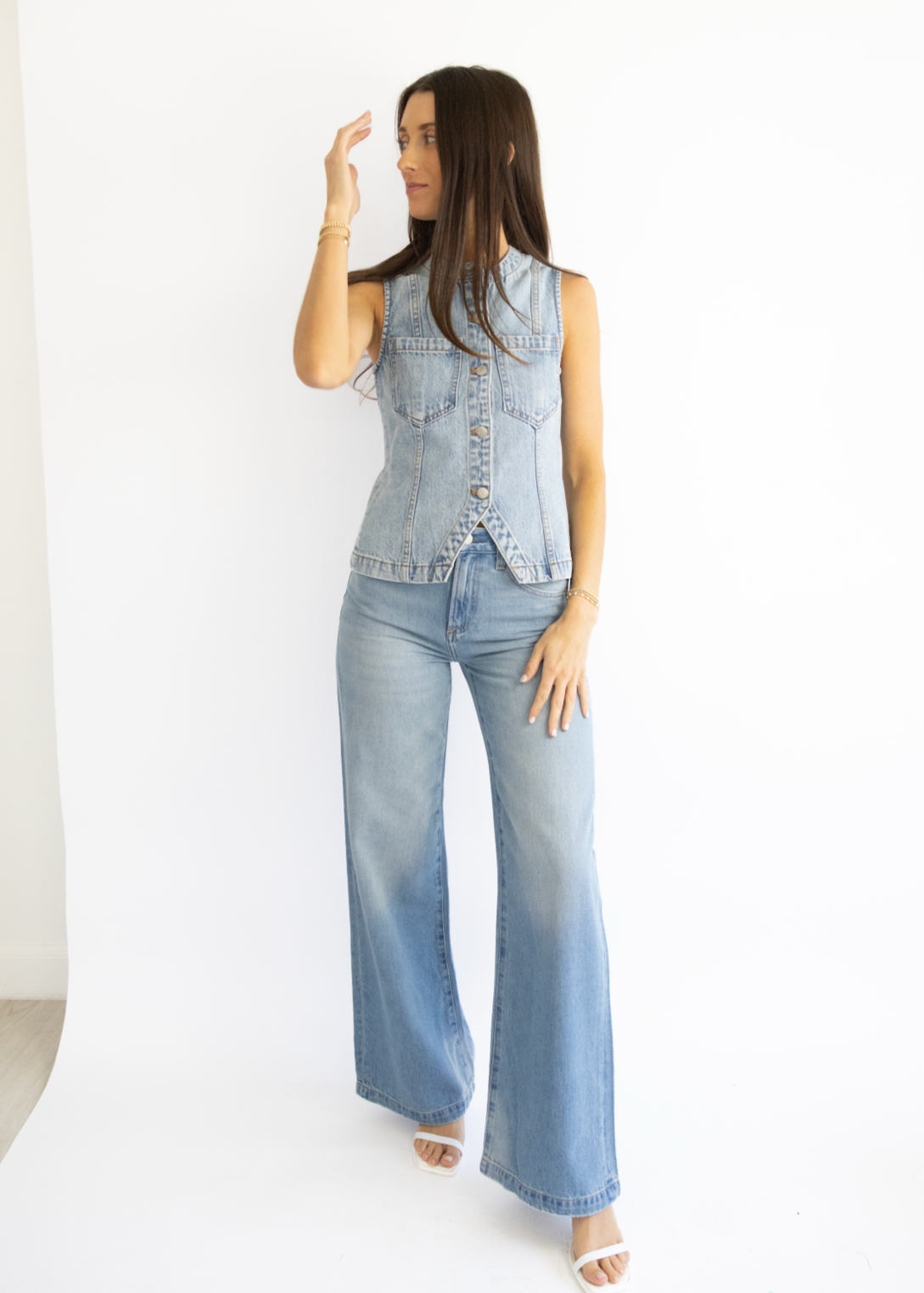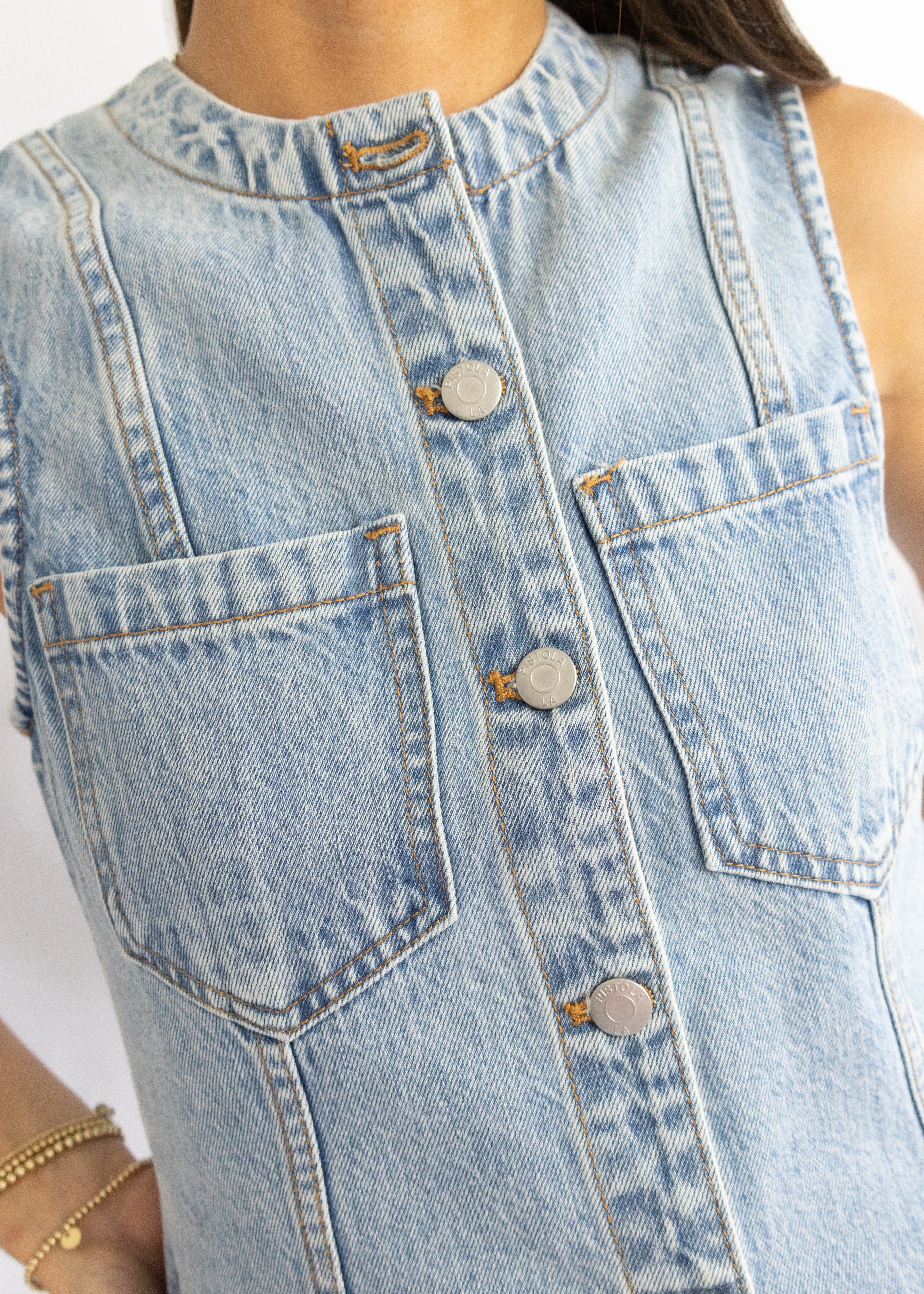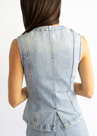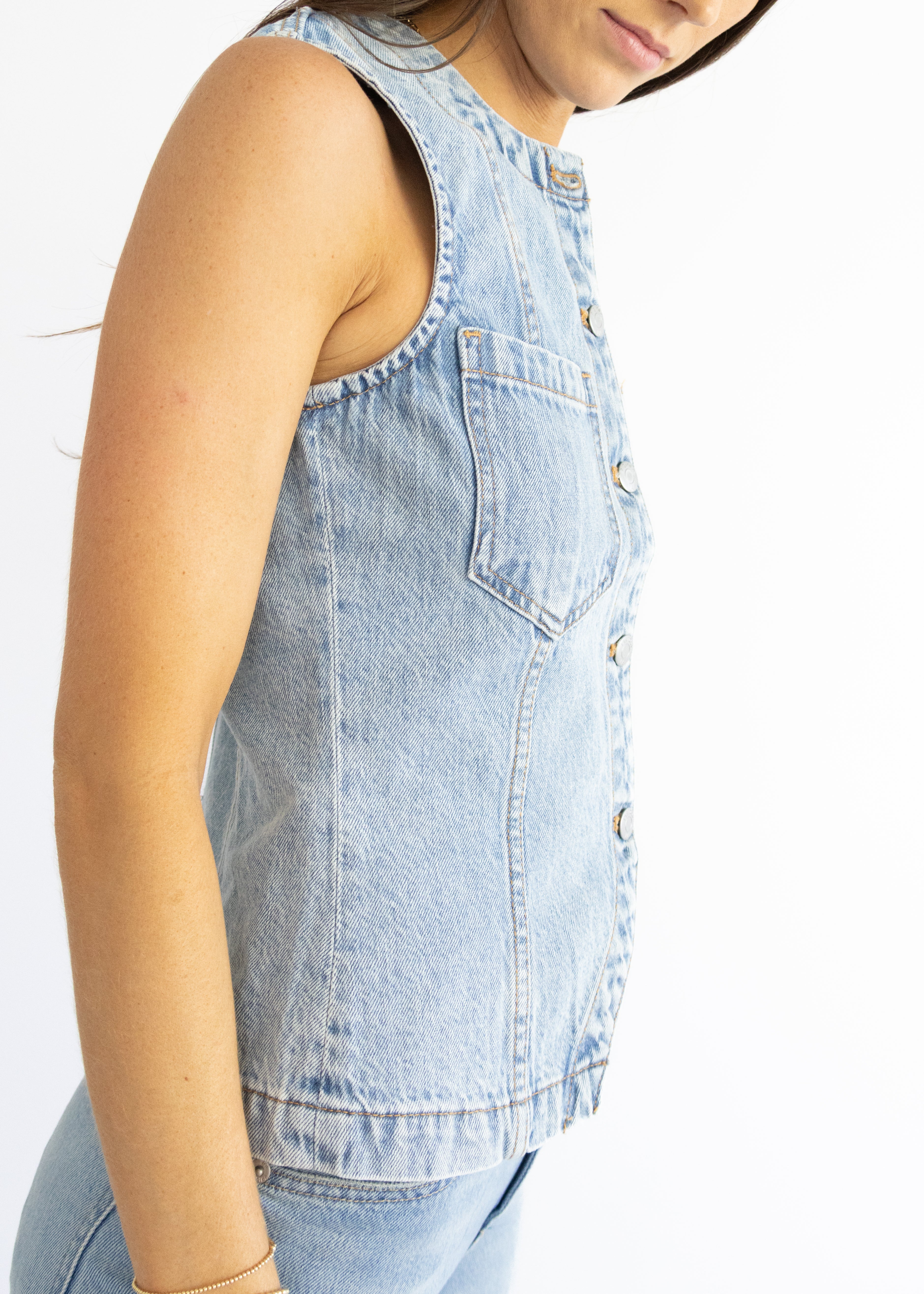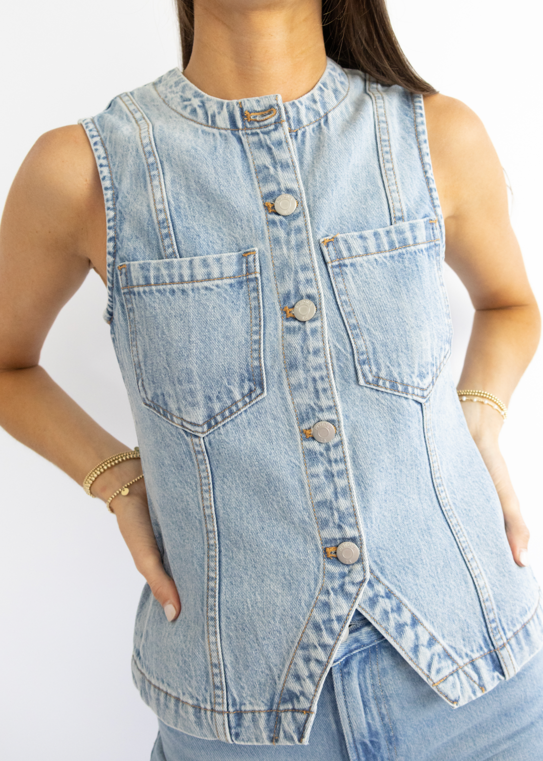 Add a modern layer to your summer rotation with the Gia Vest. Crafted from structured yet comfortable denim, this collarless silhouette features a clean round neckline and a flattering fitted shape that hugs in all the right places. The design and streamlined seams make it perfect for pairing with everything from matching jeans to floaty skirts. Wear it buttoned up as a top or open as a lightweight layer—this one does it all!
