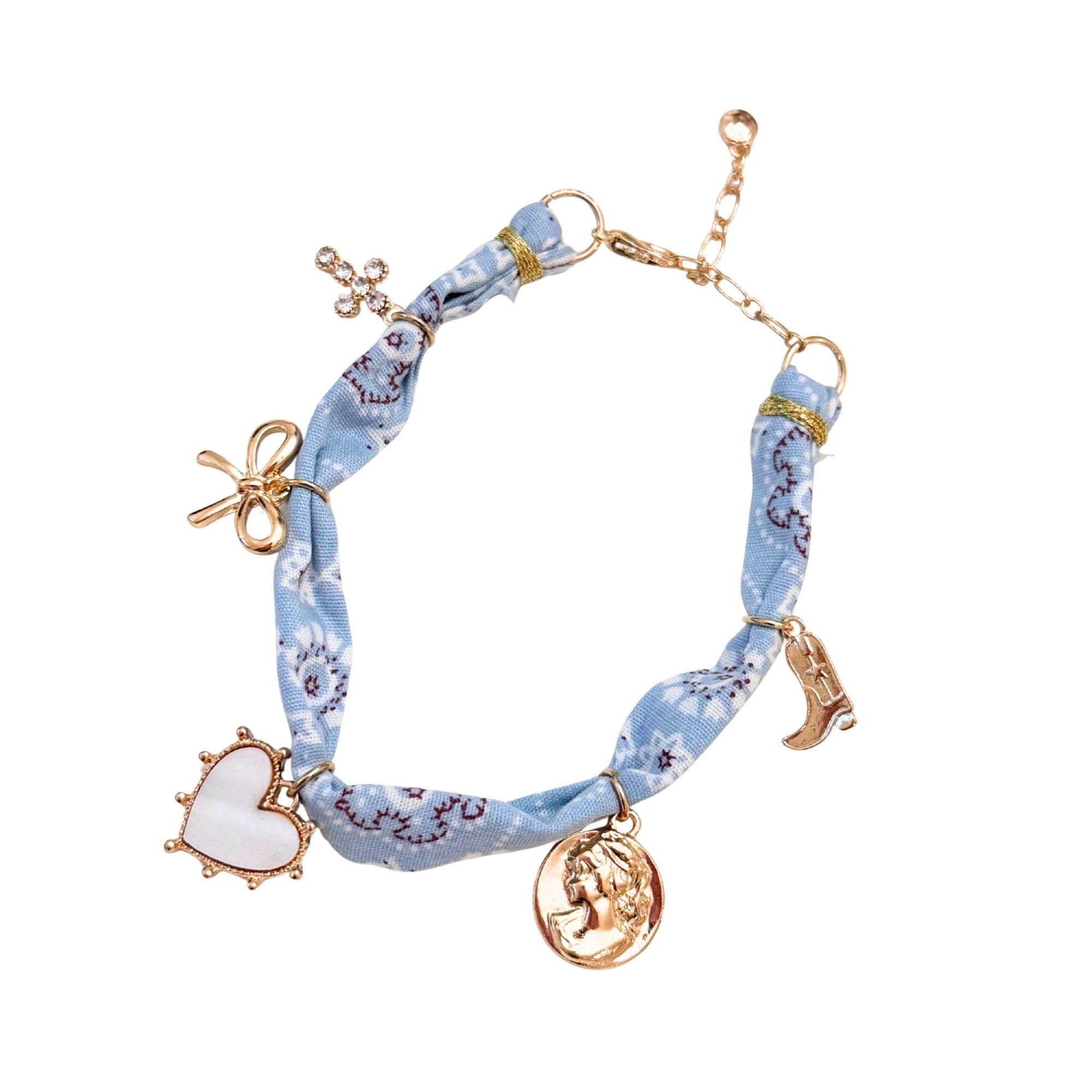 Add a western-inspired twist to your look with this blue bandana bracelet, designed with a soft printed bandana band and finished with five fixed pendants for the perfect blend of casual charm and boutique style.
