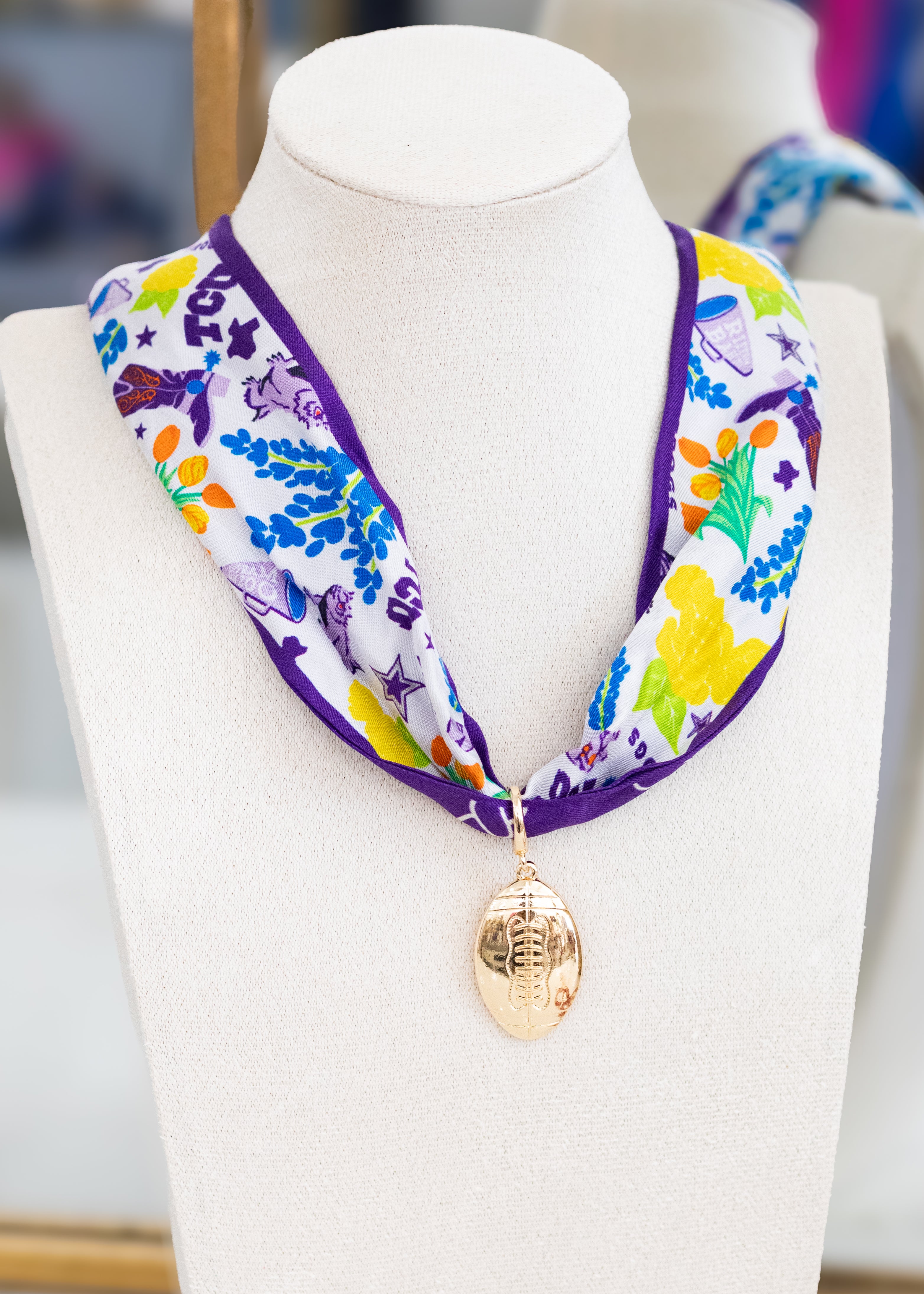 Go Frogs! ππ Our TCU Scarf with Gold Football Pendant is the ultimate game-day accessory. The silky purple-and-white design pops with school spirit, while the shiny gold charm adds a fun, elevated finish. Wear it your way β around your neck, in your hair, or tied to your clear bag β and cheer on TCU in style!